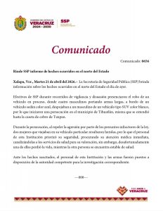 En un comunicado emitido casi 24 horas después, la Secretaría de Seguridad Pública (SSP) informó que los hechos se originaron tras el robo de un vehículo por parte de cuatro hombres armados, lo que derivó en la persecución. Asimismo, indicó que los elementos involucrados, junto con las armas, fueron puestos a disposición de la autoridad competente, mientras que la Fiscalía General del Estado continúa con las investigaciones para esclarecer este lamentable suceso.